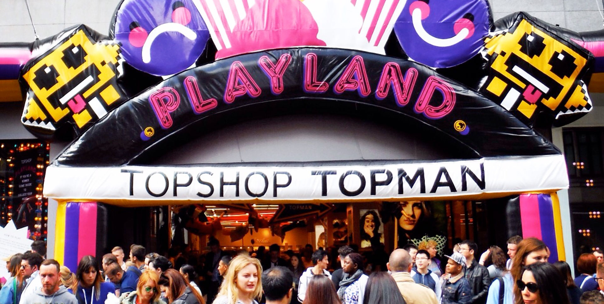 Featuring nostalgic arcade game characters like Ms. PacMan and Zoltar, Topshop allowed “players” to grab colorful plastic balls with a giant claw crane for a larger-than-life shopping experience that left them with an awesome story and some very fashionable swag.